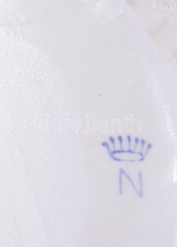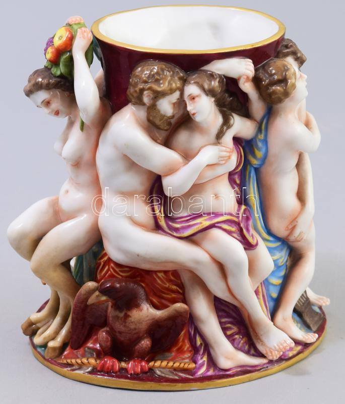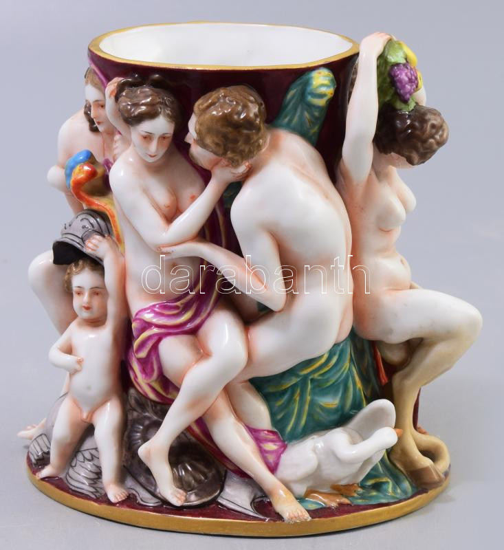 Doccia Ginori "Bacchanalia" váza. cca 19. sz. második fele - 20. sz. eleje, gazdag plasztikus figurális formavilággal díszített váza, kézzel festett, jelzett, egy lábfej restaurált, m: 12,5 cm /// Doccia Ginori 'Bacchanalia' vase. Circa second half of the 19th century - early 20th century, richly decorated vase with plastic figurative forms, hand-painted, signed, with one foot restored, height: 12.5 cm.