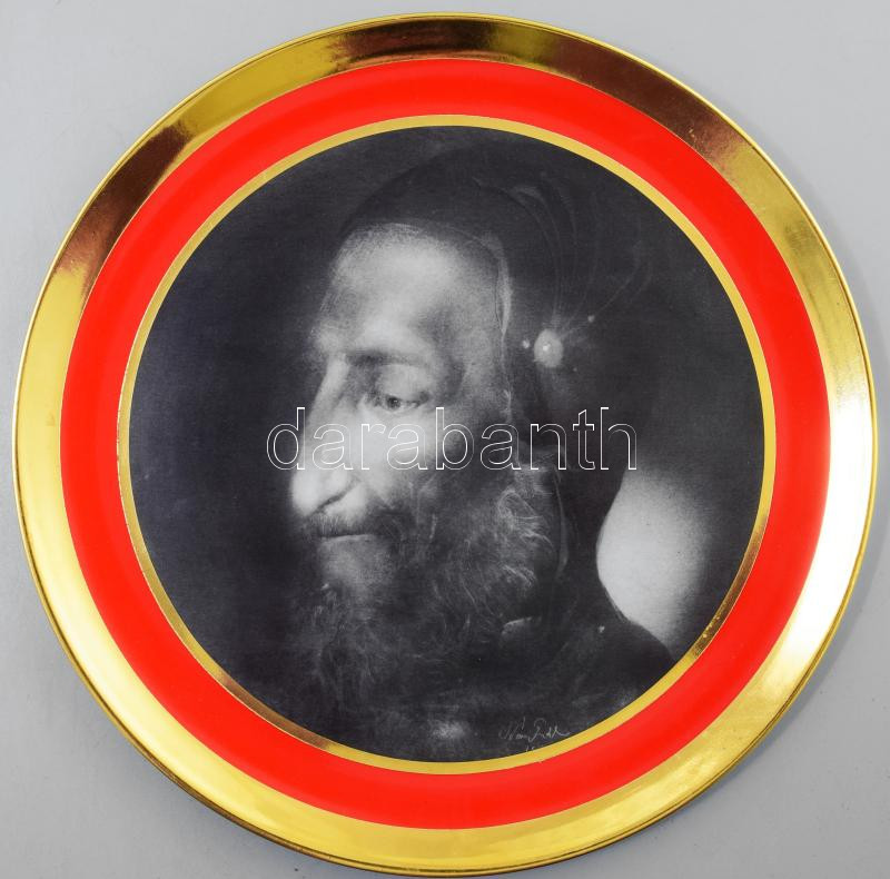 Hollóházi Porcelánmanufaktúra, Szász-Stúdió, Szász Endre (1926-2003): Férfi arc. Jelzett, piros csíkozással, d: 30,5 cm. Készült 200 példányban, háttérszín szerinti sorszáma 1/20. /// Hollóházi Porcelain Factory, Szász Studio, Endre Szász (1926-2003): Male face. Marked, with red striping, diameter: 30.5 cm. Made in 200 copies.