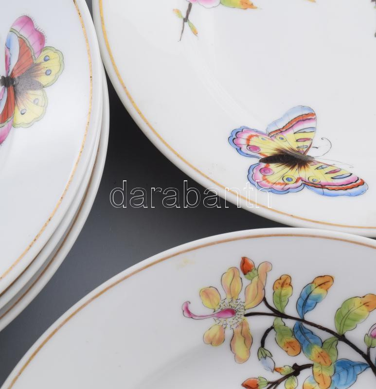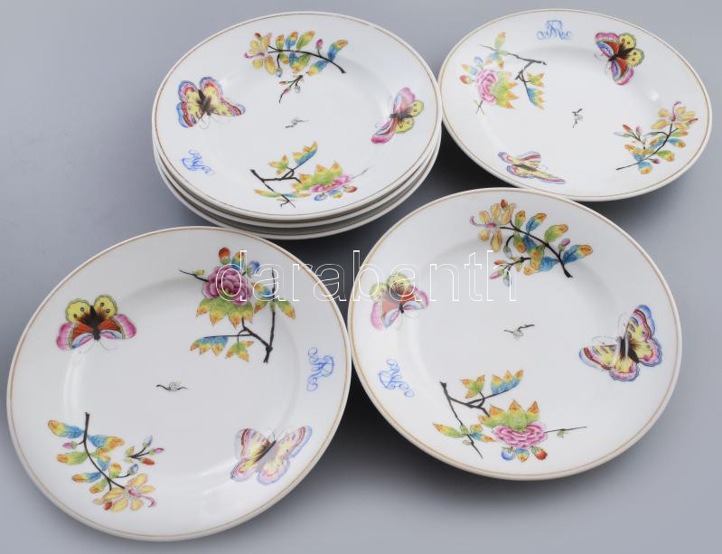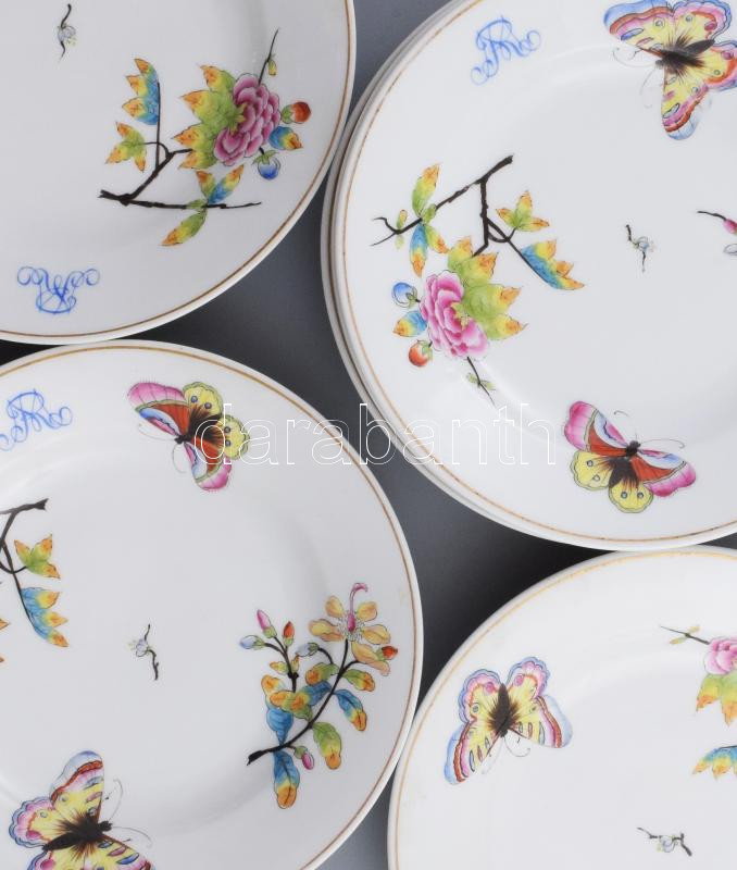 cca 1870-1880, A Herendi Viktória mintát utánzó, Hausmaler Karl Anton által festett 6 darabos mélyített tányér szett. A tányérok császári tiszti hagyatékból származnak, peremükön Rehák Magda tulajdonos monogramja látható. Mesterjelzése lekopott, masszába nyomott formaszámokkal jelzett, kopott, d: 22,5 cm /// Circa 1870-1880, Hausmaler Karl Anton: Herend Victoria-patterned 6-piece deep plate set. The plates come from the estate of an imperial officer, and the rim features the monogram of the owner, Magda Rehák. The master mark has worn off, and they are marked with impressed shape numbers, worn, diameter: 22.5 cm.