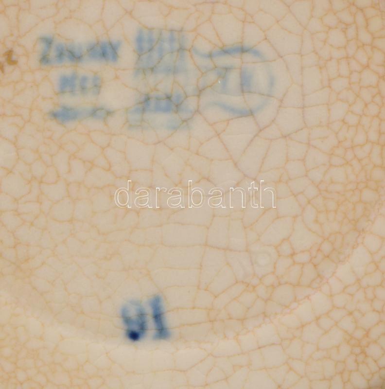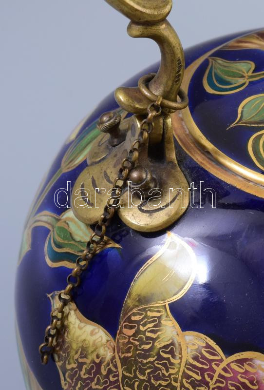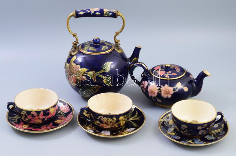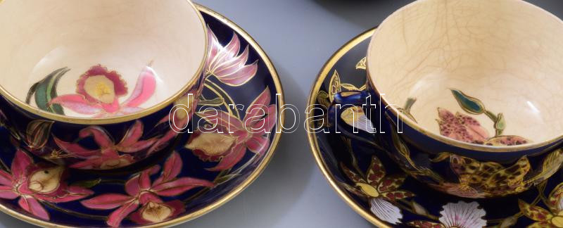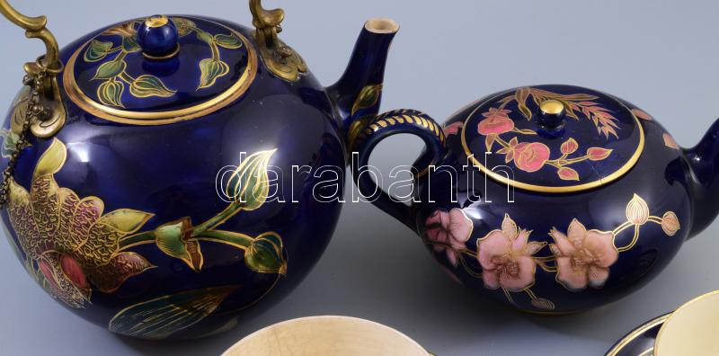 cca 1875-1880, Zsolnay Rothschild báró orchideás készlet 8 darabja. Terv.: Zsolnay Teréz. Öntött finomfajansz, kobalt alapon fényaranyozással aranykontúrozott magastüzű mázakkal festve. Három darab csésze aljjal, klf orcidea mintákkal díszítve, kiöntő, kiöntő réz szerelékkel. Mindegyik jelzett: kékkel festett családi pecsét. Mázrepedéssel, repedéssel, lepattanással, egyik fedél ragasztott, egyik kiöntő rész lefűrészelt. /// "A készletet a szenvedélyes orchideakedvelő bécsi Rotschild báró rendelte. Mintául remek illusztrált könyvet küldött, amelynek alapján Juliska majd minden darabra más-más virágot tervezett. A készlet a legkülönbözőbb alakú talpastálakból, kávés- és teáscsészékből, tányérokból, kannákból, cukortartókból és evőeszköznyelekből állt, huszonnégy személyes volt, és 800 forintba került. A díszítés kobaltkék alapon arannyal szegélyezett virágokból állt, és jól érvényesítette a magastüzű zománc minden árnyalatát. A Rotschild egzotikus, kedvenc virágaival díszített tányérok és csészék csakhamar sok család asztalán pompáztak." /// Circa 1875-1880, 8 pieces of the Zsolnay Baron Rothschild orchid set. Design: Teréz Zsolnay. Molded fine faience, painted with high-fired glazes outlined in gold on a cobalt background. Includes three cup saucers, decorated with various orchid patterns, a pouring jug, and a pouring jug with brass fittings. Each piece is signed: with a blue painted family mark. There is glaze crazing, a crack, and a chip; one lid is glued, and one pouring piece has been sawed off. /// "The set was commissioned by the passionate orchid enthusiast, Baron Rothschild of Vienna. He sent a superbly illustrated book as a model, based on which Juliska designed different flowers for almost every piece. The set consisted of a variety of shaped serving dishes, coffee and tea cups, plates, jugs, sugar bowls, and cutlery holders, catering to twenty-four people, and it cost 800 forints. The decoration featured flowers bordered in gold on a cobalt blue background and showcased every nuance of high-fired enamel. The plates and cups adorned with Rothschild's exotic favorite flowers soon flourished on many family tables.