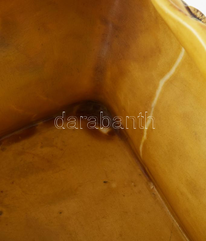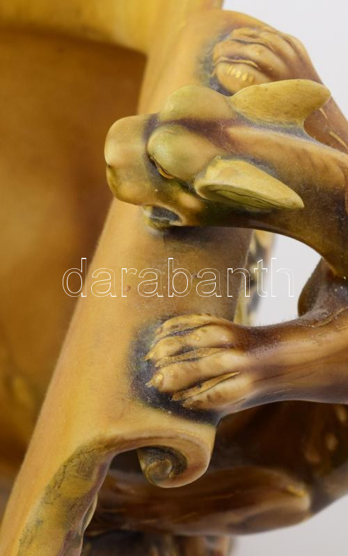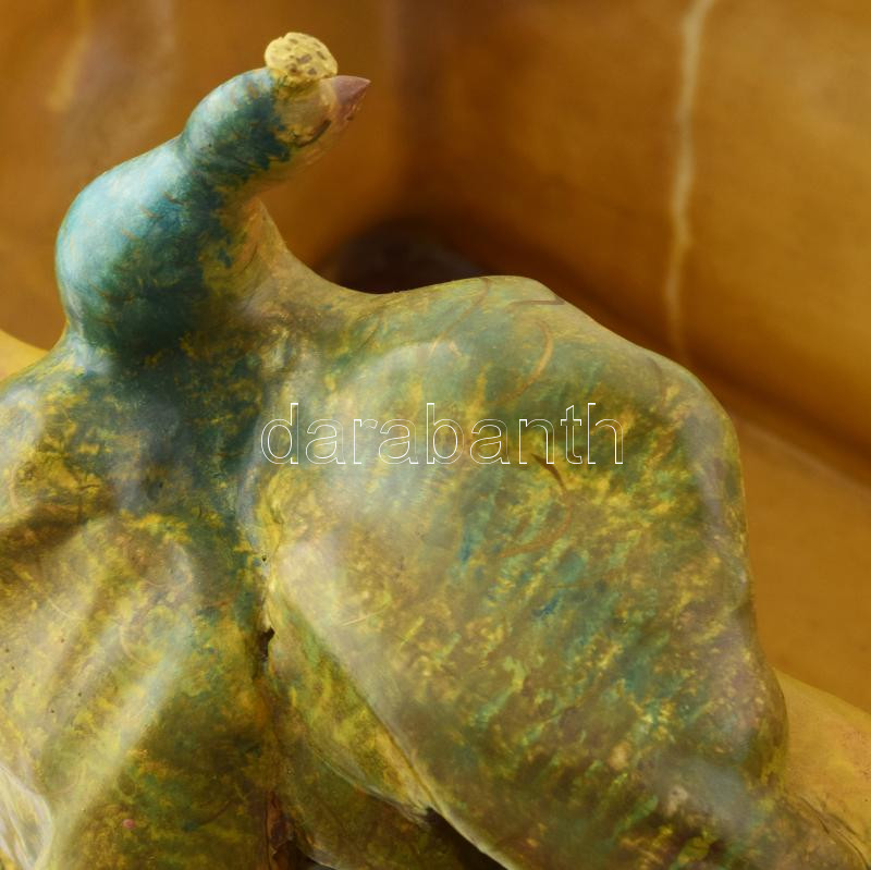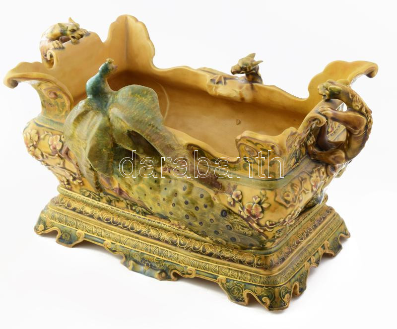 cca 1875-1880, Zsolnay kínai modorú virágtartó edény. Magastüzű mázakkal fedett kőporcelán, a kínai kultúra jellegzetes szimbólumaival díszítve: domború nyíló cseresznyevirágok, virágra szálló legyek, paradicsommadarak, illetve plasztikus fácán, sárkány és chilong alakok.Jelzett: máz alatti kobaltkék családi pecsét, 1031 formaszám. Restaurált, 46x26x26 cm. KIZÁRÓLAG SZEMÉLYES ÁTVÉTEL, NEM POSTÁZZUK / ONLY PERSONAL COLLECTION IN OUR OFFICE! /// Circa 1875-1880, Zsolnay Chinese-style flower pot. High-fired porcelain covered with glazes, decorated with characteristic symbols of Chinese culture: raised cherry blossoms, flies landing on flowers, paradise birds, and three-dimensional figures of a pheasant, dragon, and chilong. Signed: cobalt blue family mark under the glaze, shape number 1031. Restored, dimensions: 46x26x26 cm. /// ONLY PERSONAL COLLECTION, WE DO NOT SHIP / ONLY PERSONAL COLLECTION IN OUR OFFICE!"