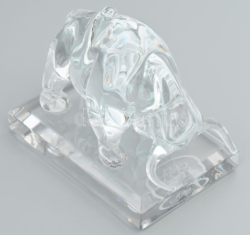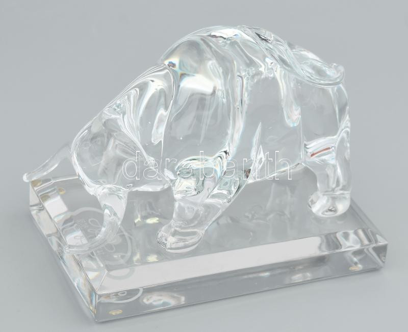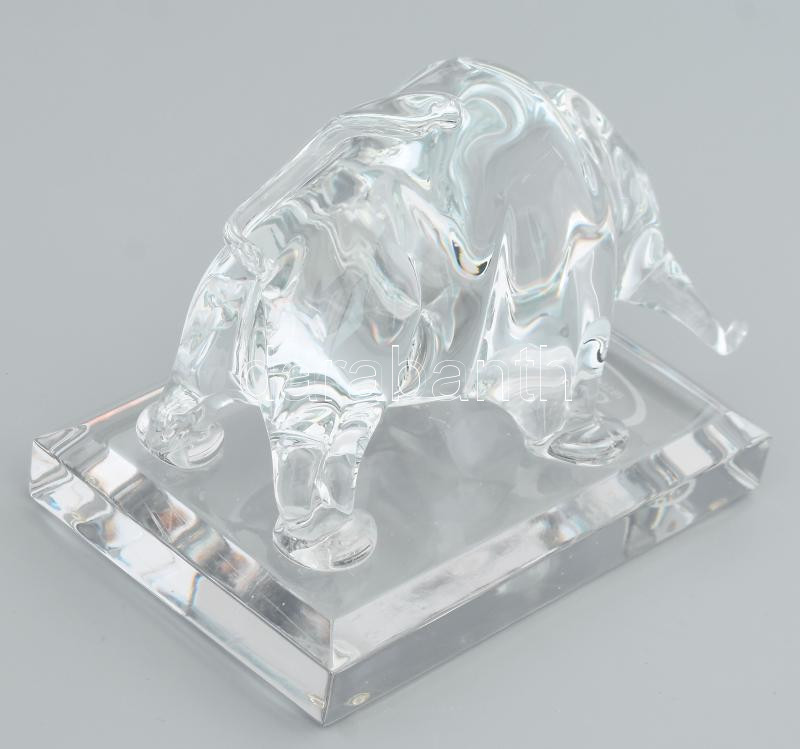 Description: Ajka Crystal kristály bika figura talpazaton. Jelzett, eredeti dobozában, hibátlan, 15x10x12 cm /// Ajka Crystal crystal bull figure on a base. Marked, in its original box, flawless, dimensions: 15x10x12 cm.