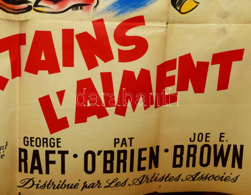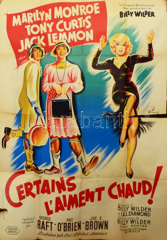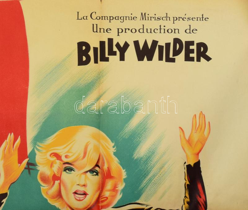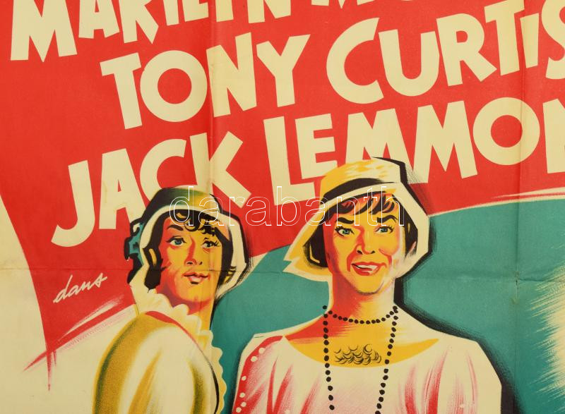 1959 Van, aki forrón szereti (Certains l'aiment chaud/Some Like It Hot) c. amerikai film francia óriásplakátja, rendezte: Billy Wilder, főszerepben: Marilyn Monroe, Tony Curtis, Jack Lemon, hajtott, szakadt, sérült, 160x120 cm.