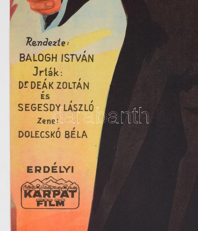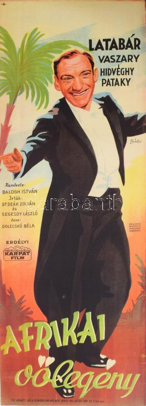 Afrikai vőlegény, 1944. Moziplakát (filmplakát, rácsplakát). Latabár Kálmán, Vaszary Piri, Hidvéghy Valéria és mások szereplésével. Rendezte: Balogh István. Litográfia, papír. Bódis jelzéssel a plakáton. Kellner Márkus Nyomda, Bp. Erdélyi - Kárpát Film. Kováts Béla Filmreklám. Lapszéli apró szakadásokkal, gyűrődésekkel, máskülönben jó állapotban. 84×29 cm. / Vintage Hungarian poster of a movie, with small tears on the edges, otherwise in good condition, lithograph on paper.