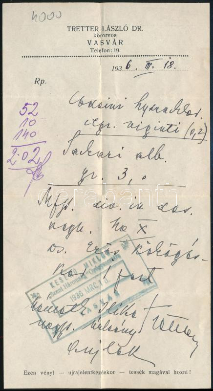 1936 Vasvár, Keserű Miklós "Szentháromság" Gyógyszertára Recept-Vény b...