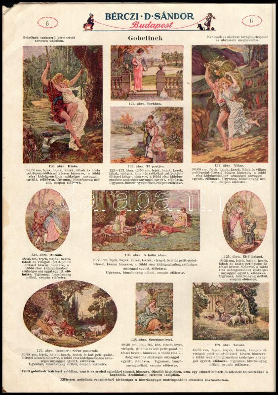 Description: cca 1928-30 Bérczi D. Sándor női kézimunka értesítő. 43. évf. Színes, 64 oldalas képes katalógus gobelinekről, függönyökről, dísztárgyakról. Kiadói papírkötés, foltos és kissé sérült borítóval, sérült kötéssel, helyenként kissé foltos lapokkal, utolsó néhány lap felső sarkában sérült. + 2 db 8 oldal terjedelmű árlap