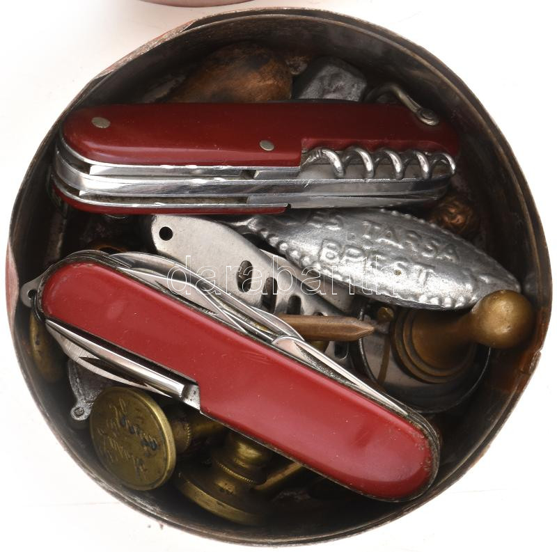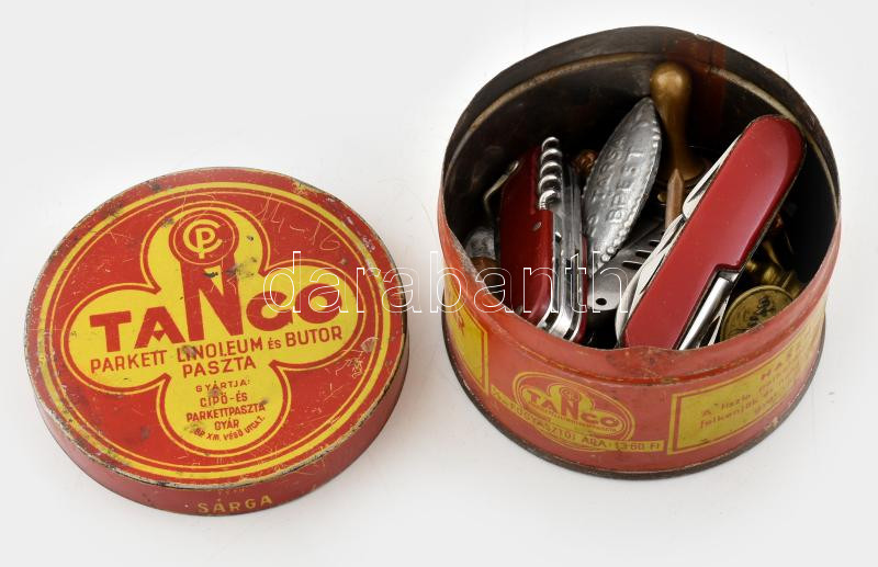 Vegyes bolha tétel, Tangó paszta pléhdobozban, d: 10,5 cm (Bicska, pecsétnyomó, sörnyitó)