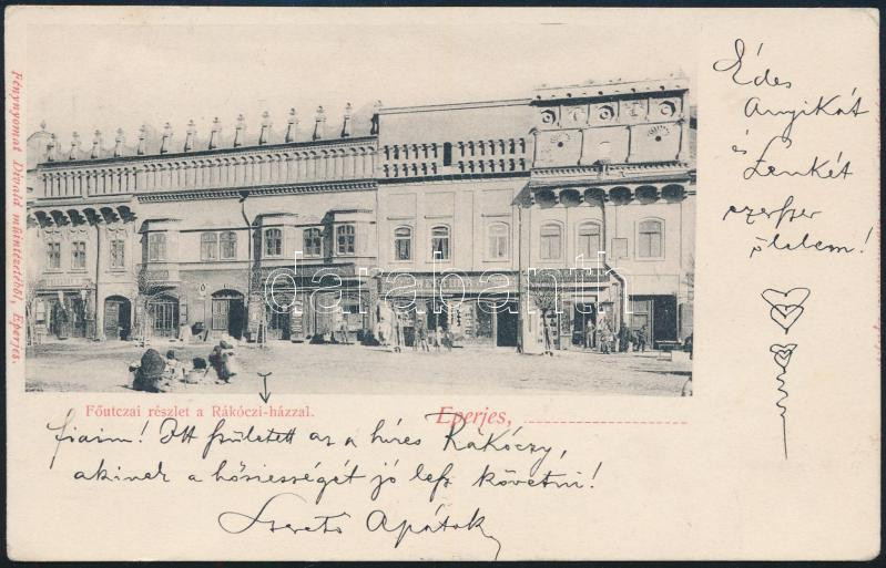 Description: 1904 Kézdi-Kovács László (1864-1942) festőművész, műkritikus autográf sorai képeslapon családjához Eperjesről, a képeslapon a Rákóczi-házzal, "Fiaim! Itt született a híres Rákóczy, akinek a hősiességét jó lesz követni! Szerető apátok."