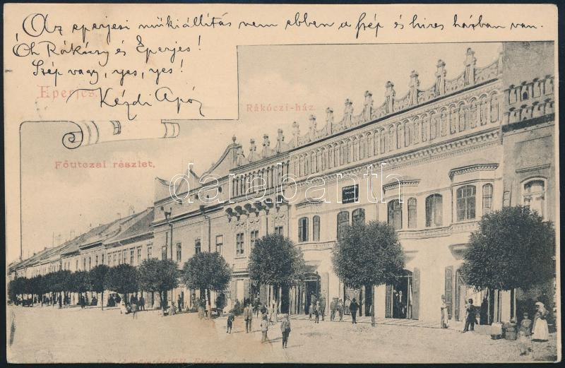 Description: 1904 Kézdi-Kovács László (1864-1942) festőművész, műkritikus autográf sorai képeslapon családjához Eperjesről, a képeslapon Eperjes főutcájával és a Rákóczi-házzal. "Az eperjesi műkiállítás nem ebben a szép és híres házban van. Oh Rákóczy és Eperjes! Szép vagy, yes, yes!"