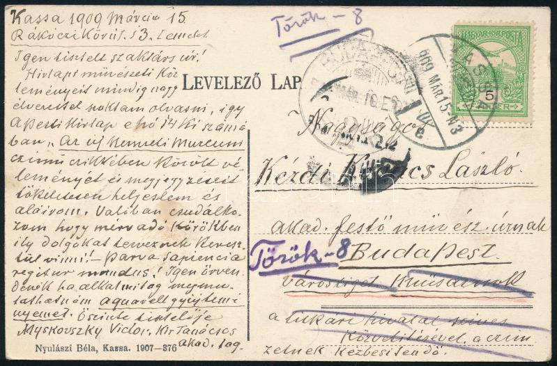 1909. március 15., Kassa, Myskovszky Viktor (1838-1909) művészettörténész, építészmérnök, a Magyar Tudományos Akadémia levelező tagja autográf sorai Kézdi-Kovács László (1864-1942) festőművész, műkritikushoz, amelyben reagál egy a Pesti Hírlapban megjelent, "Az Új Nemzeti Múzeum" c. cikkére és örülne, ha akvarell gyűjteményét megmutathatná Kézdi-Kovácsnak. Myskovszky Viktor autográf aláírásával, Kassai dóm nyugati főkapuját megörökítő képeslapon.