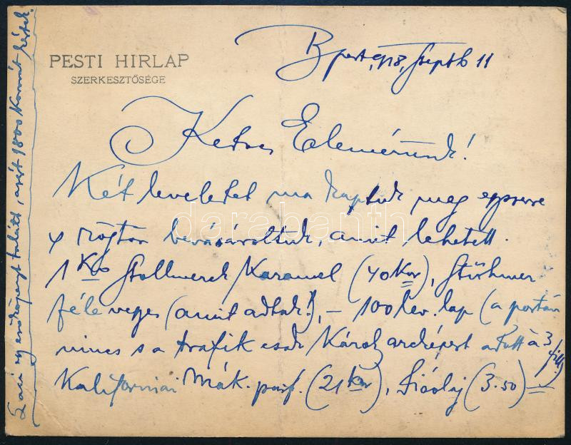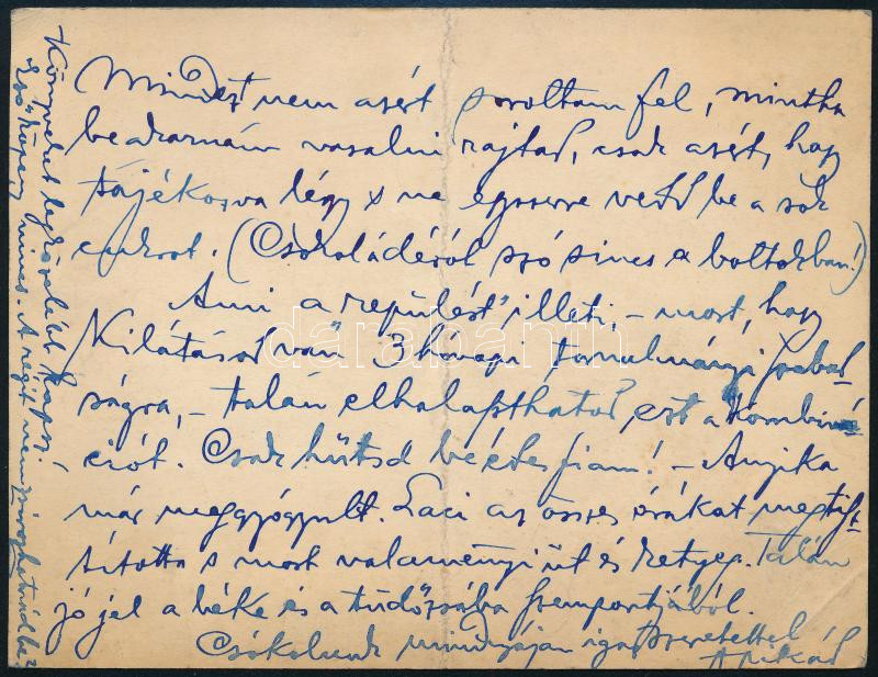 Description: 1918 Kézdi-Kovács László (1864-1942) festőművész, műkritikus autográf levele fiához, Kézdi-Kovács Elemér (1898-1976) későbbi festőművészhez, feltehetően az I. világháborús frontra. Két beírt oldal, Kézdi-Kovács László autográf aláírásával ("Apikád"), Pesti Hírlap szerkesztősége fejléces kártyán, töréssel.