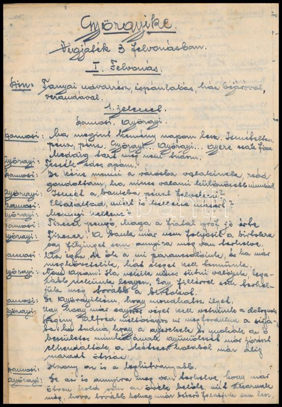 1946 Gyöngyike, vígjáték 3 felvonásban, írta: Bognár Lajos. Orosz hadifogolytáborban írt kézirat! Korának megfelelő állapotban.