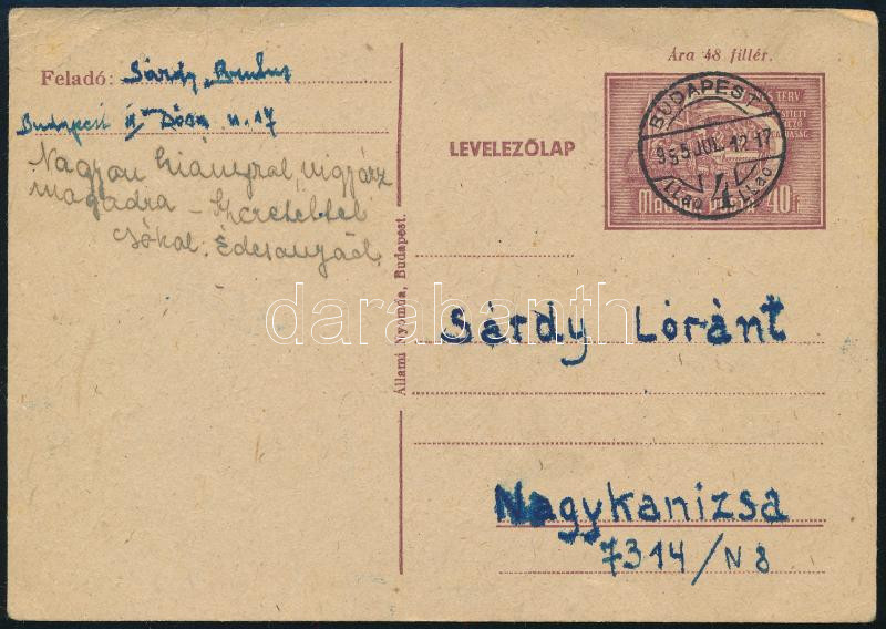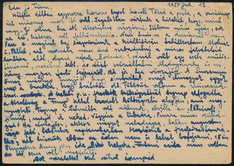 1955 Sárdy Brutus (1892-1970) festőművész, restaurátor levele fiához, Sárdy Lóránt (1931-2014) festőművész, restaurátorhoz, amelyben említi találkozását Molnár C. Pál festőművésszel valamint Bodnár Évával, Oelmacher Annával és egy cseh műtörténésszel, aki Mednyánszky képeiről kér diákat. Sok egyéb érdekes részlettel, külön néhány szóból álló üdvözlő sorokkal Sárdy Lóránt édesanyjától, Kézdi-Kovács Lenkétől, Kézdi-Kovács László (1864-1942) festőművész, műkritikus lányától. Közel másfél beírt oldal levelezőlapon.