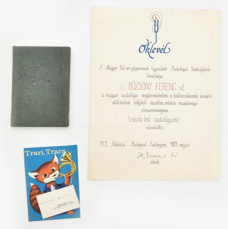 1983 A Magyar Fül-orr-gégeorvosok Egyesületének oklevele Bőzsöny Ferenc (1931-2018) előadóművész, a Magyar Rádió főbemondója részére, amelyben munkája elismeréseképpen tiszteletbeli audiológussá választották + 1997 Dombóváriak találkozója Dombóvárért, Bőzsöny Ferenc nevére kiállított üres könyv + Bőzsöny Ferenc névjegykártyája és autográf sorai kivágott könyvborítón