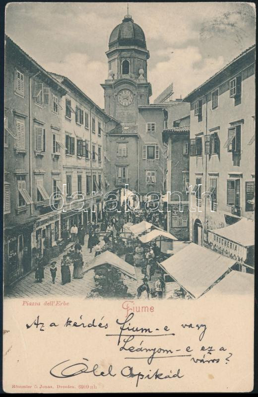 Description: cca 1904 Kézdi-Kovács László (1864-1942) festőművész, műkritikus autográf sorai képeslapon családjához, Fiuméről, a képeslapon a "Piazza dell'Erbe". "Az a kérdés fiam-e vagy lányom-e ez a város?"