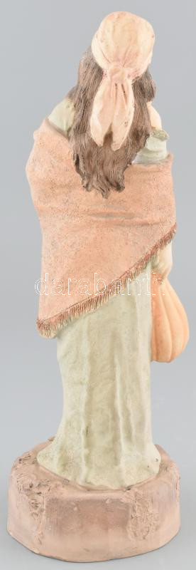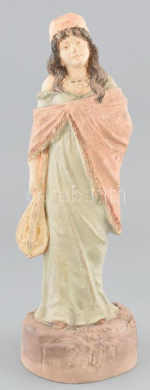 Jelzés nélkül: Olasz mandolinos lány, kézzel festett terrakotta, kopásokkal, m: 33,5 cm