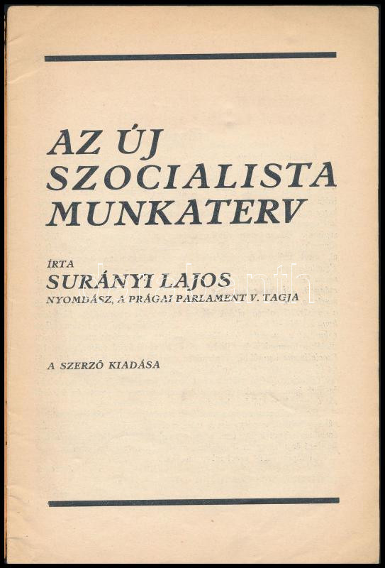 Surányi Lajos: Az új szocialista munkaterv. Kiadói papírkötés. Bp., (1934.), Kir. M. Egyetemi Nyomda, 32 p. Kiadói papírkötés.