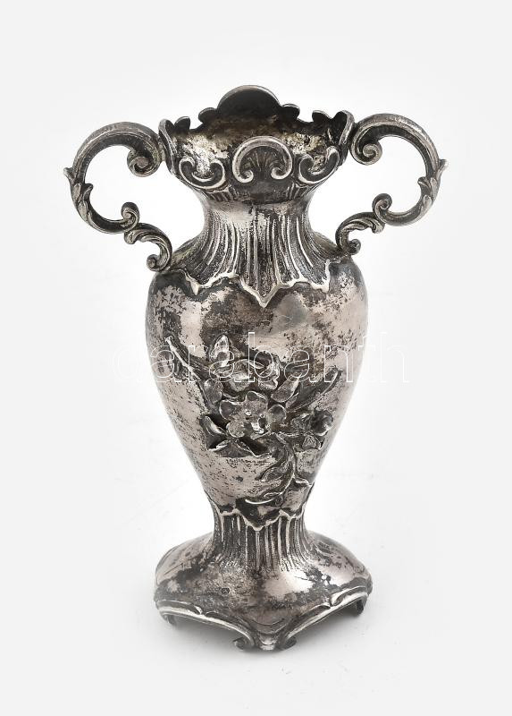 Ezüst (Ag) szecessziós vázácska, plasztikus virágdíszítéssel. Jelzett, korának megfelelő állapotban, 47,3 g, m: 9,5 cm