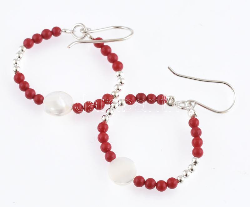 Ezüst(Ag) fülbevalópár korall díszítéssel, jelzés nélkül, d: 3 cm, bruttó: 3 g