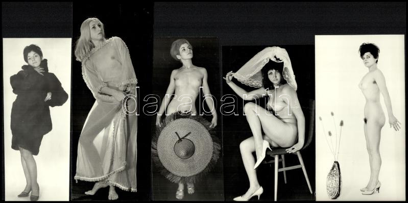 Bundában, kalapban, fátyolban és egy szál semmiben - cca 1977 előtt készült, szolidan erotikus felvételek, 5 db vintage fotó jelzés nélkül, ezüst zselatinos fotópapíron, 17,8x7,2 cm és 14,5x6 cm között
