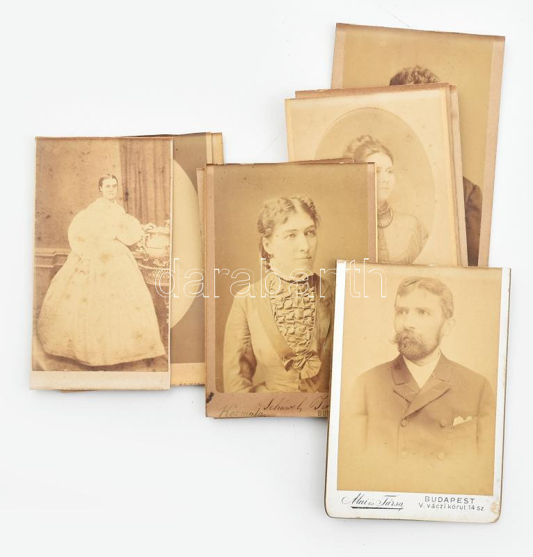 cca 1880-1900 10 db vizitkártya, közte két domborított porcelánhatású fotó is, különböző műtermekből (Décsey Ede, Hess Fridolin, Gondy és Egey, stb.) Feliratozottak (a képen szereplők nevével és életrajzi adataival, több csak részben olvasható), tetejükön/szélükön körbevágva, 10x6,5 cm körül