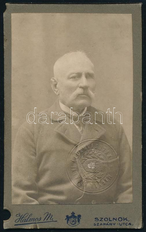 Description: cca 1916 Félszemű idős férfi, Nagy Imre nyugbéres lakatos portréja, vintage keményhátú fotó Halmos Miklós szolnoki műterméből, hátoldala MÁV jegy, kissé sérült, 10,5x6,5 cm