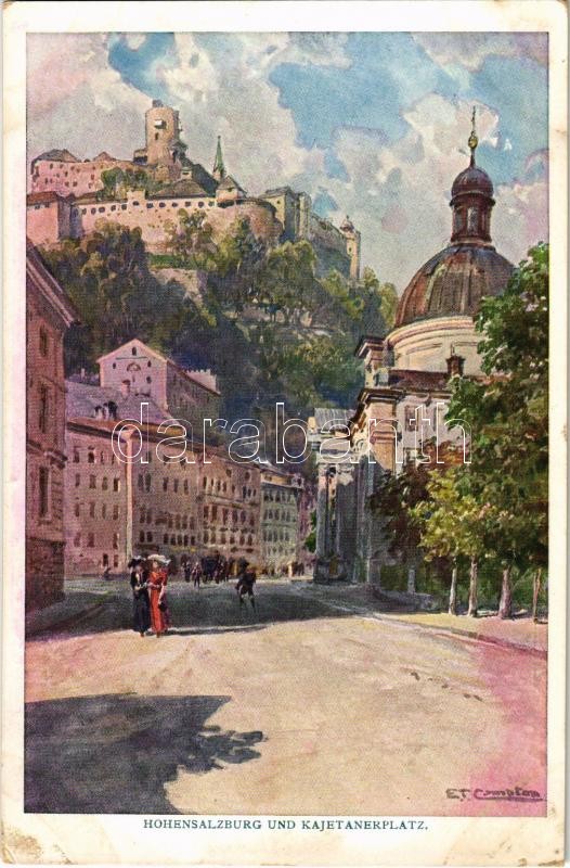 Salzburg, Hohensalzburg und Kajetanerplatz, Künstlerpostkarte "Kollektion Kerber" Nr. 68. s: E. T. Compton (fl)