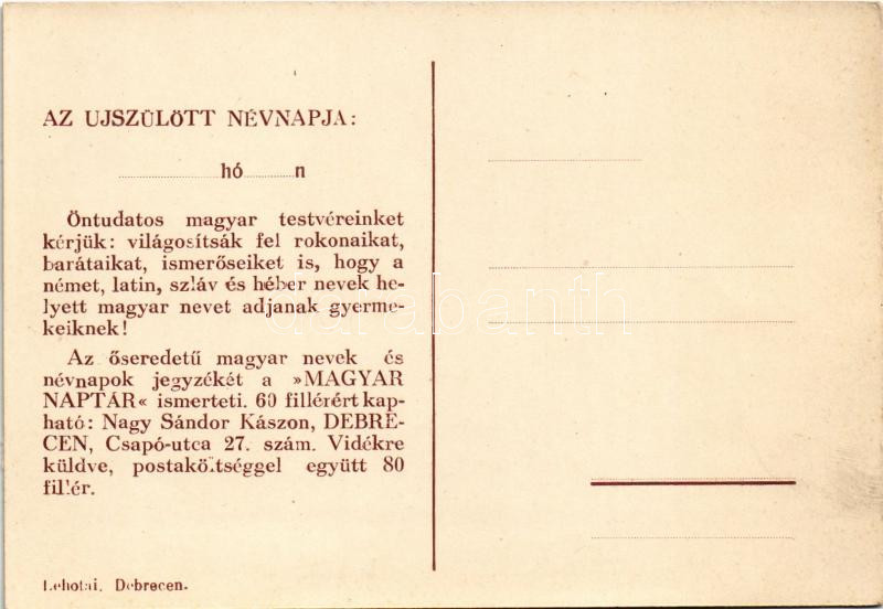 Description: "Öntudatos magyar testvéreinket kérjük: világosítsák fel rokonaikat, barátaikat, ismerőseiket is, hogy a német, latin, szláv és héber nevek helyett magyar nevet adjanak gyermekeiknek!" Lehotai kiadása / Hungarian irredenta propaganda