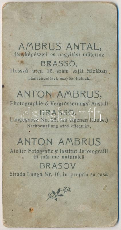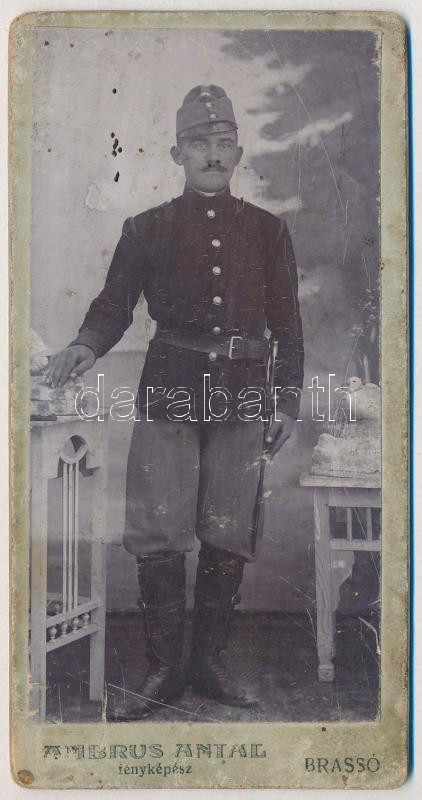 Brassó, Kronstadt, Brasov; Osztrák-magyar katona tÅ‘rrel, keményhátú fotó - Ambrus Antal fényképészeti és nagyÃtási műterem, Brassó, Hosszú utca 16. szám saját házában, reklám a hátoldalon (6,4 x 12,5 cm) (fl)