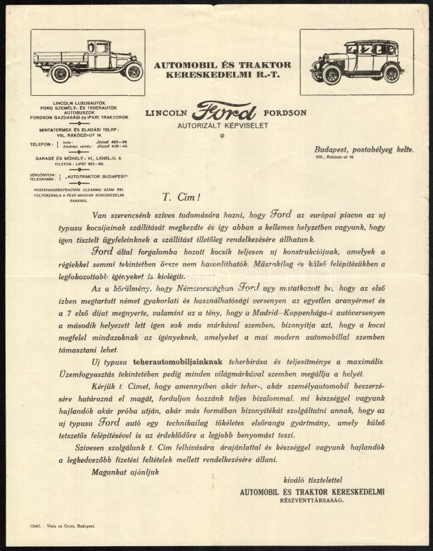 cca 1920 Automobil és Traktor Kereskedelmi Rt. Lincoln, Ford, Fordson ...