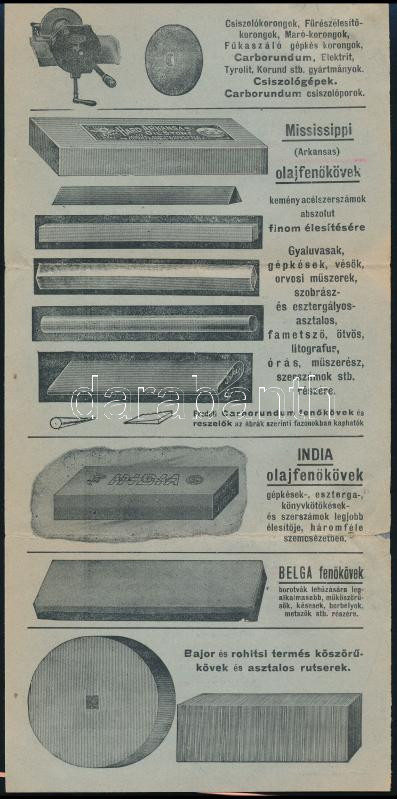 cca 1930 Csiszolóáru, köszörűkövek, stb. kihajtható kétoldalas reklámo...