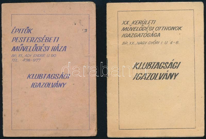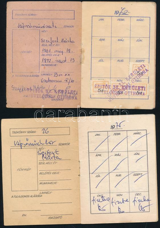 1972 Építők művelődési háza tagsági 2 db, egyik bélyegekkel