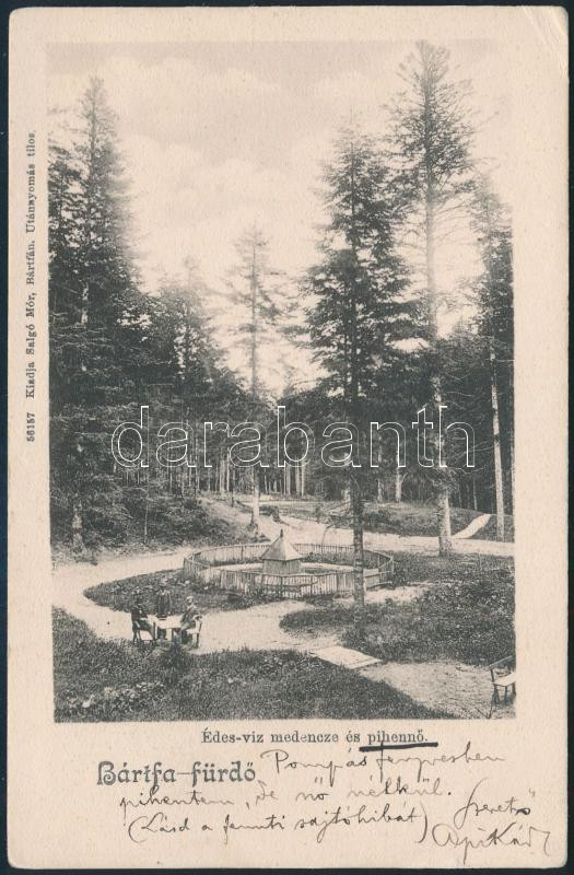 Description: 1900 Bártfa-fürdő, Kézdi-Kovács László (1864 - 1942) festőművész képeslapja, Bártfa-fürdő. "Pompás fenyvesben pihentem, de nő nélkül. (Lásd a fenti sajtóhibát.) Szerető Apikád."