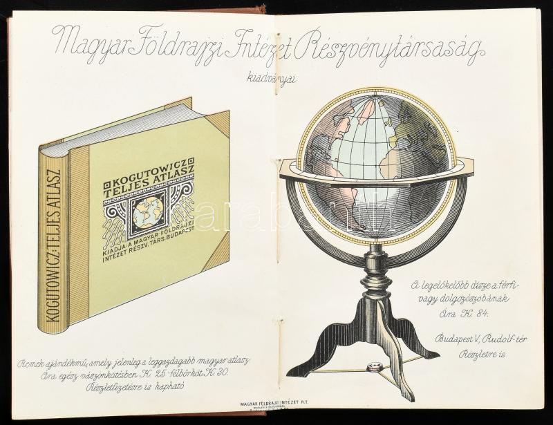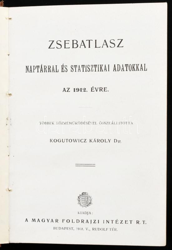 Description: 1912 Zsebatlasz naptárral és statisztikai adatokkal az 1912. évre. Többek közreműködésével összeáll.: Kogutowicz Károly. Bp., Magyar Földrajzi Intézet, 8 p. + 1 t. + XLII t. (színes térképek) + 128 p. Kiadói egészvászon-kötés, réz plakettel, kissé foltos borítóval, kissé laza fűzéssel, az elülső szennylap hiányzik.