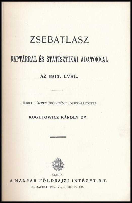 Description: 1913 Zsebatlasz naptárral és statisztikai adatokkal az 1913. évre. Többek közreműködésével összeáll.: Kogutowicz Károly. Bp., Magyar Földrajzi Intézet, 2 t. + 70+37+(6) p. + 46 t. (színes térképek). Kiadói egészvászon-kötés, az elülső szennylap hiányzik.