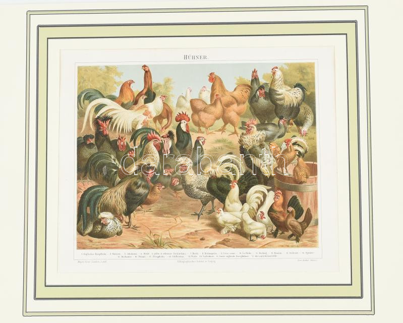 cca 1896 Tyúkfélék (Hühner), nyomat, papír, Meyers Konversations-Lexikon 5. kiadás, paszpartuban, 22,5x28 cm