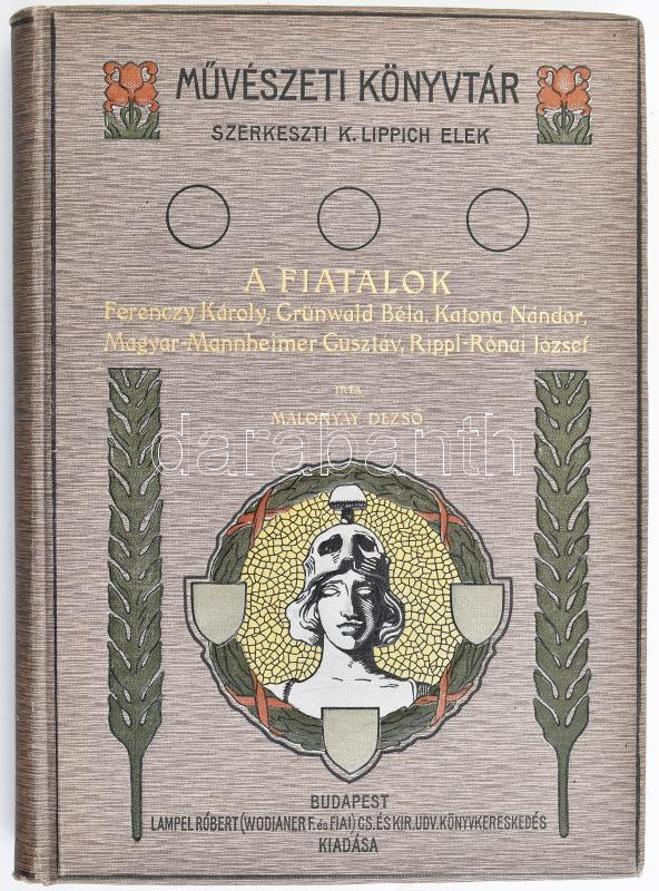 Malonyay Dezső: A fiatalok. Ferenczy Károly, Grünwald Béla, Katona Nándor, Magyar-Mannheimer Gusztáv, Rippl-Rónai József. Művészeti könyvtár. Bp.,1906, Lampel R. (Wodianer F. és Fiai.), 224 p.+16 t.+ 3 hasonmás. Szövegközti és egészoldalas képekkel gazdagon illusztrált. Kiadói szecessziós aranyozott, illusztrált egészvászon-kötés, a borítón kis kopásnyomokkal.