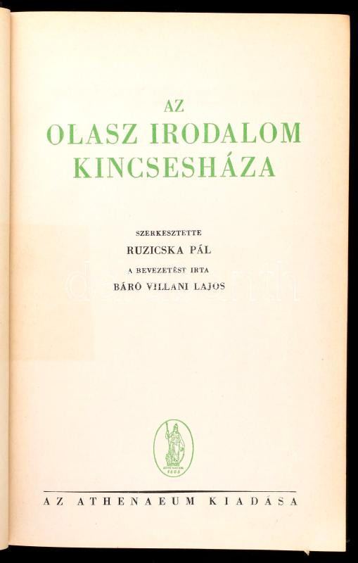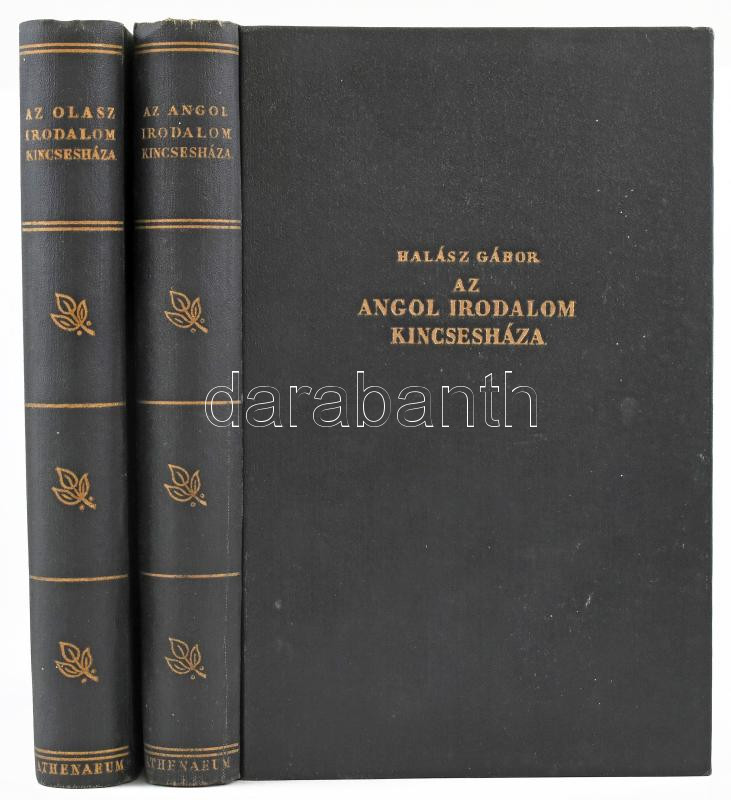 Description: Az Európai Irodalom Kincsesháza sorozat 2 kötete: Az olasz irodalom kincsesháza. Szerk.: Ruzicska Pál. A bevezetést írta: báró Villani Lajos. + Az angol irodalom kincsesháza. Szerk.: Halász Gábor. Bp., é.n., Athenaeum. Kiadói aranyozott egészvászon-kötés, a borítókon némi kopással.