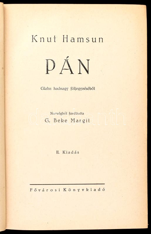 Hamsun, Knut: Pán. Glahn hadnagy följegyzéséből. Ford.: G. Beke Margit. (Bp.), é.n., Fővárosi Könyvkiadó, 189+(3) p. Második kiadás. Kiadói aranyozott egészvászon-kötés