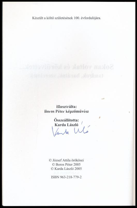 Description: [József Attila]: Sokan voltak és körülvettek... tanárok, barátok, szerelmek. Összeáll.: Karda László. Boros Péter illusztrációival. Az összeállító által ALÁÍRT példány. hn., 2005., Kaditron. Kiadói papírkötés.