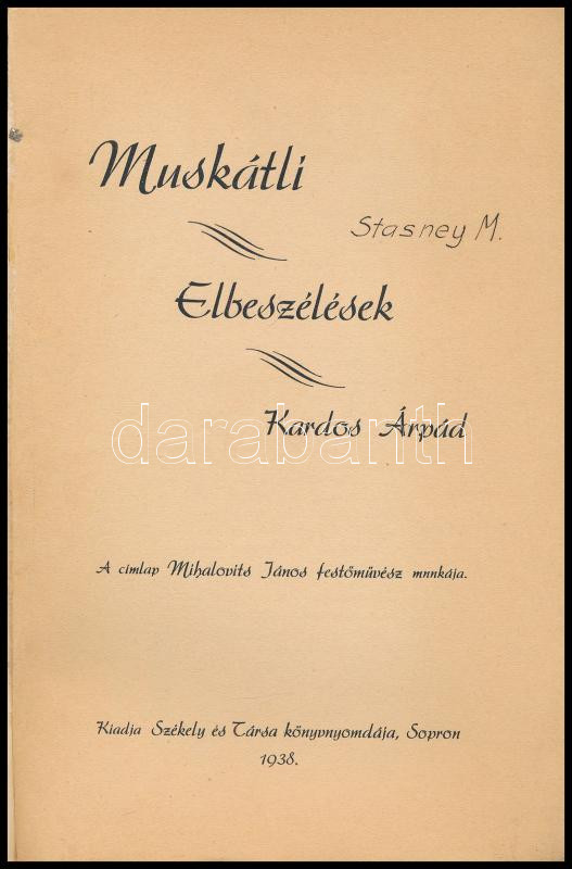 Description: Kardos Árpád: Muskátli. Elbeszélések. A borító Mihalovits János festőművész munkája. Sopron, 1938., Székely és Társa, 142+1 p. Kiadói papírkötés, kissé foltos borítóval. Ritka!