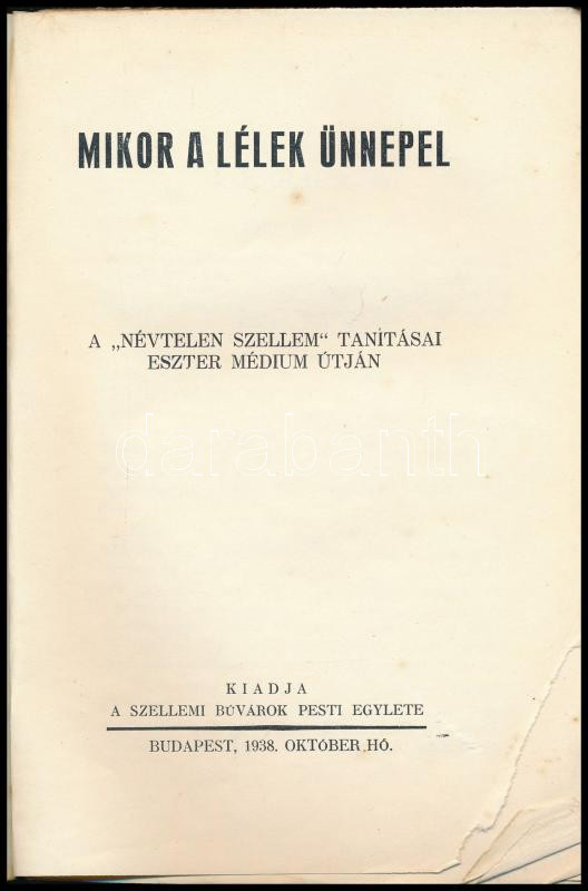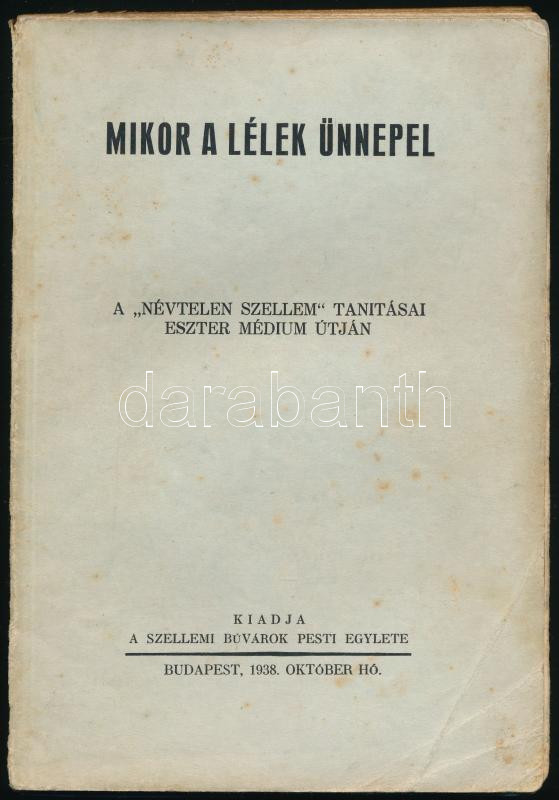 Mikor a lélek ünnepel. A ,,Névtelen Szellem" tanításai Eszter médium ú... https://www.darabanth.com/en/431-Online-auction/431.0/Books/Books-Other-rarities~4000025/Mikor-a-lelek-unnepel-A-Nevtelen-Szellem-tanitasai-Eszter-medium-utjan-Bp-1938-Szel~II2773429