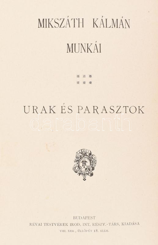 Mikszáth Kálmán: Urak és parasztok. Bp.,én., Révai,(Pallas-ny.), 6+224 p. Kiadói aranyozott, festett egészvászon-kötés, Gottermayer-kötés, festett lapélekkel, kopott, kissé foltos borítóval, hiányzó címlappal, és hiányzó hátsó szennylappal.
