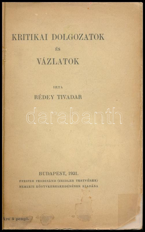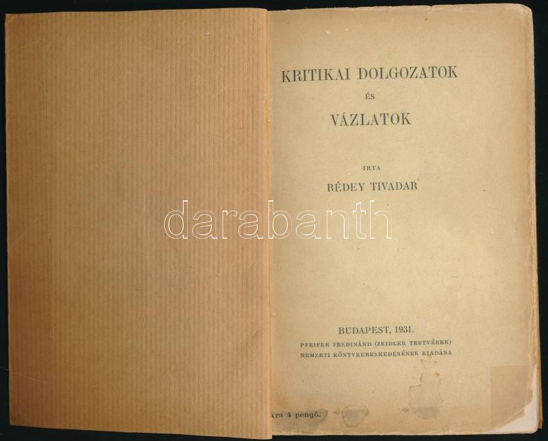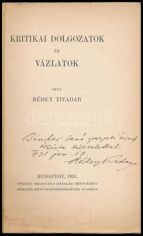 Rédey Tivadar: Kritikai dolgozatok és vázlatok. A szerző, Rédey Tivadar (1885-1953) könyvtáros, színház- és irodalomtörténész, az Országos Széchényi Könyvtár főigazgató-helyettese által dedikált példány. ("Binder Jenő igazgató úrnak őszinte tisztelettel. (1)931. jan. 13.") Bp., 1931, Pfeifer Ferdinánd,(Zeidler Testvérek), 159+1 p. Papírkötés, bekötött, javított eredeti elülső papírborítóval, ceruzás aláhúzásokkal.