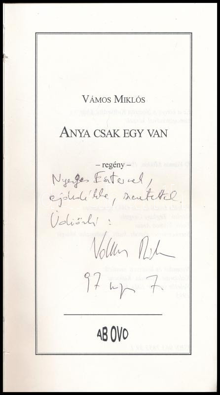 Vámos Miklós: Anya csak egy van. Regény. A szerző, Vámos Miklós (1950-... https://www.darabanth.com/en/431-Online-auction/431.0/Books/Books-Other-rarities~4000025/Vamos-Miklos-Anya-csak-egy-van-Regeny-A-szerzo-Vamos-Miklos-1950-altal-DEDIKALT-peld~II2773040
