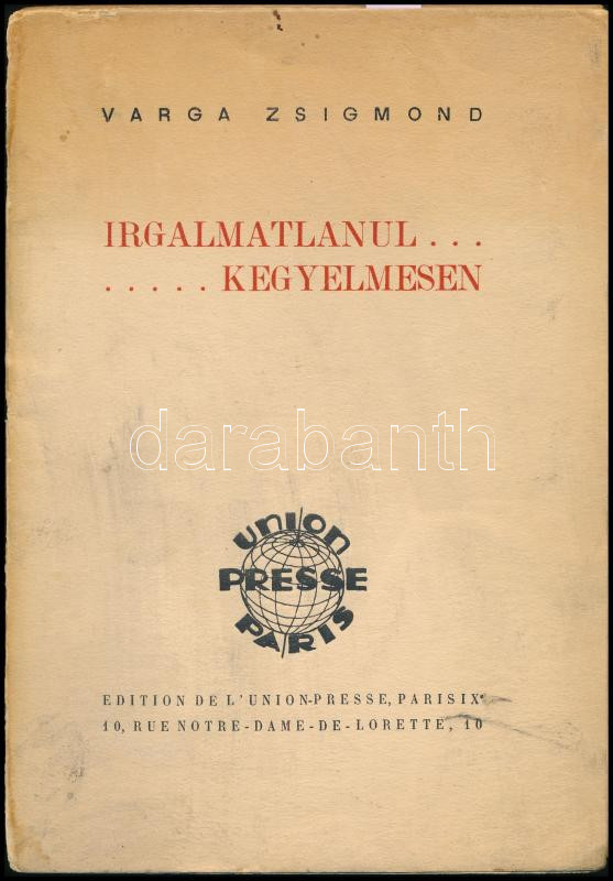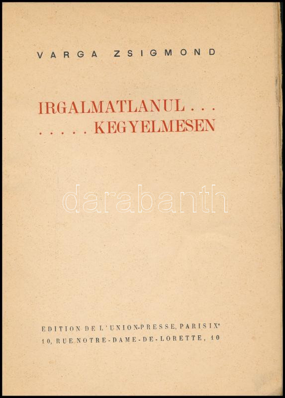 https://www.darabanth.com/en/431-Online-auction/431.0/Books/Books-Other-rarities~4000025/Varga-Zsigmond-Irgalmatlanul-Kegyelmesen-Paris-1930-Union-Presse-78-p-Kiadoi-papirko~II2774840