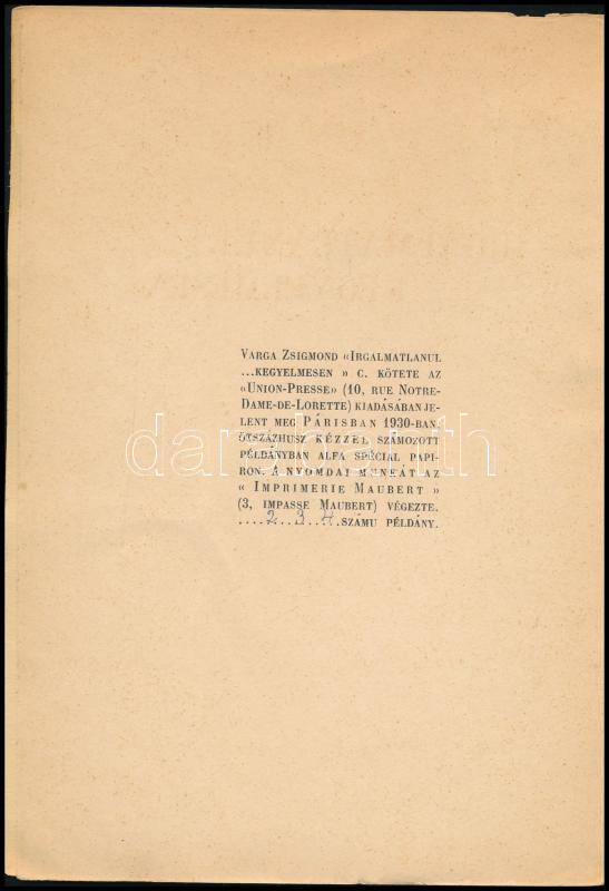 Varga Zsigmond: Irgalmatlanul... ...Kegyelmesen. Paris, 1930., Union-Presse, 78 p. Kiadói papírkötés, szakadt, kissé sérült, kissé foltos borítóval. Felvágatlan lapokkal. Számozott (234/520) példány, kézi számozással.
