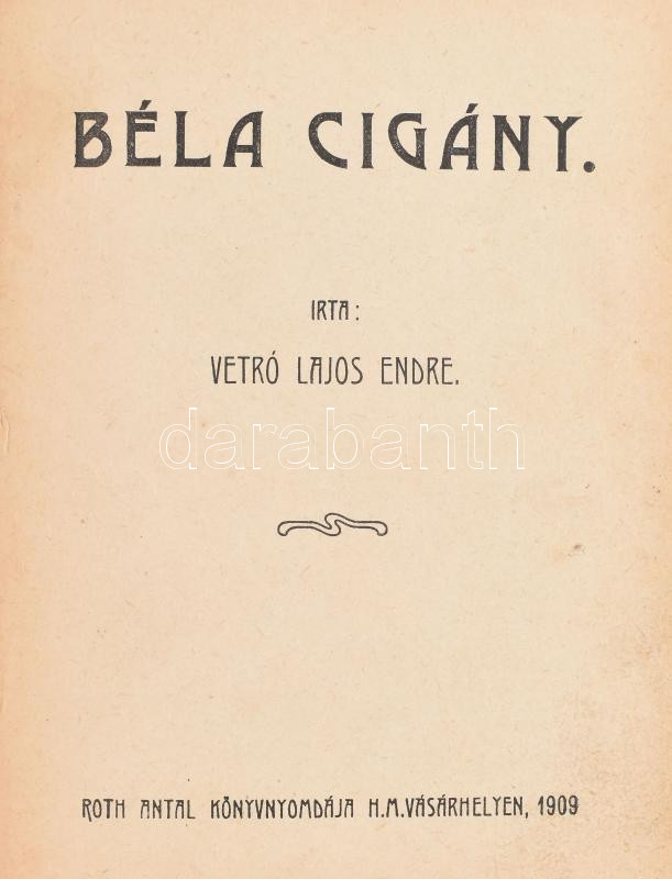Vetró Lajos Endre: Béla czigány. Marosvásárhely, 1909. Róth Antal. Kia... https://www.darabanth.com/en/431-Online-auction/431.0/Books/Books-Other-rarities~4000025/Vetro-Lajos-Endre-Bela-czigany-Marosvasarhely-1909-Roth-Antal-Kiadoi-papirboritoval-~II2774314