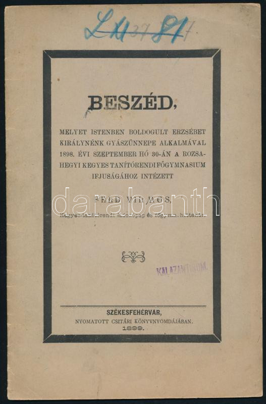 Description: Feld Vilmos: Beszéd, melyet istenben boldogult Erzsébet királynénk gyászünnepe alkalmábal 1898. évi szeptember hó 30-án a rózsahegyi kegyes tanítórendi főgymnasium ifjuságához intézett - - Kegyes-tanítórendi áldozópap és főgymn. hittanár. Székesfehérvár, 1899., Csitári-ny., 14 p. Kiadói papírkötés, intézményi bélyegzéssel, a címlapon és a borítón bejegyzéssel.