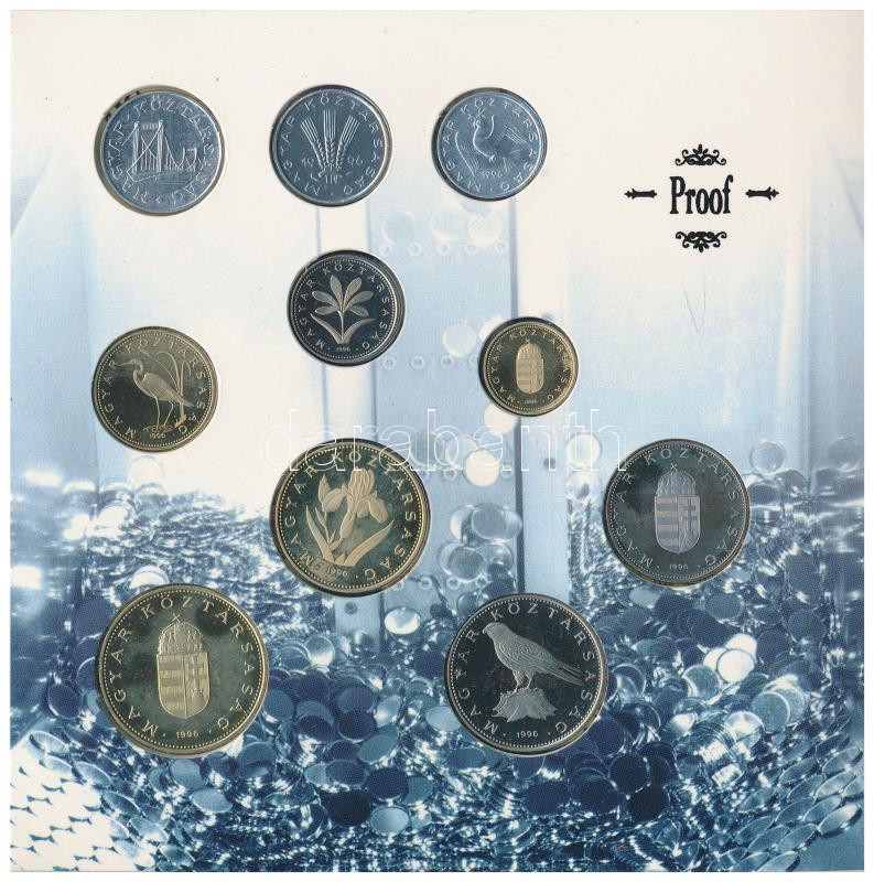 https://www.darabanth.com/en/431-Online-auction/431.0/Numismatics/Hungarian-coins-and-coins-with-Hungarian-mint-marks~1500008/1996-10f-100Ft-10klf-db-50-eves-a-forint-forgalmi-sor-disztokban-A-tokon-a-ragasztas-reszben~II2766887